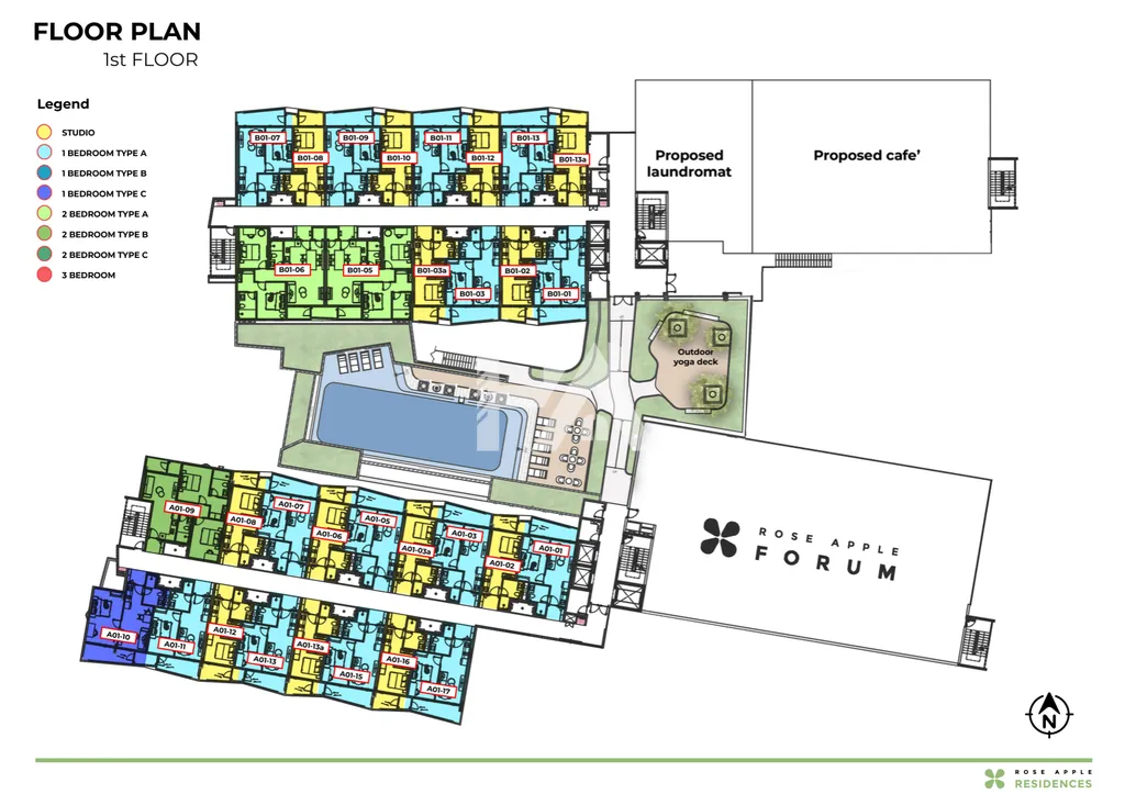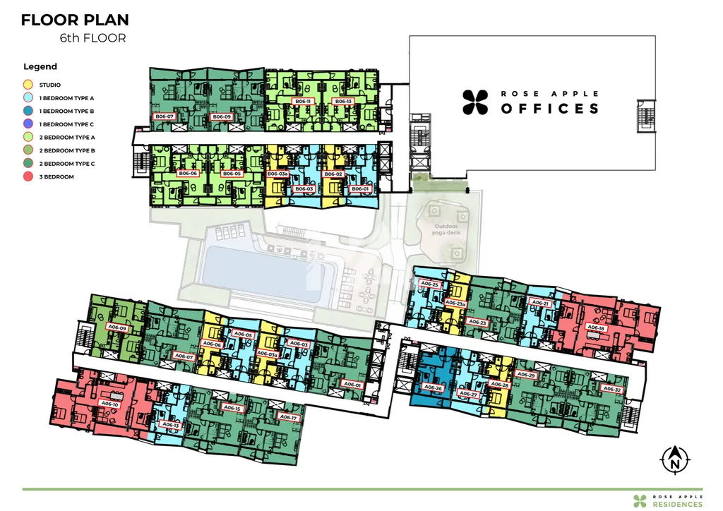 Rose Apple Residences – This is the main residential section with 207 condo units, from 32 m² studios up to 136 m² three-bedroom units. The homes are located on floors 2 to 6 across two mid-rise blocks.